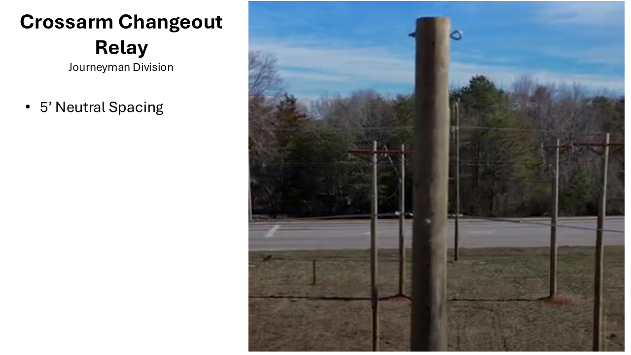 Work gloves are required for this event. Two team members will be required to perform each task. Each member of the team will be required to climb and be a groundman for this event. The framing will be a B1.11 (B1) on a 40’ pole. There will not be a conductor on either phase. The neutral will be spaced at 5’ and a 1/0 ACSR conductor will be installed at the neutral position. The neutral conductor cannot be floated. The crossarm assembly and braces will not be installed at the start of the event (bare pole at the top with holes pre-bored for the arm thru-bolt and brace thru-bolt). The first and third climber will perform a crossarm and brace installation. The second climber will perform a crossarm and brace removal. When lifting the arm into position for installation, a clove hitch tied on one end of the arm and a half hitch on the other shall be used. When lowering the arm for removal, a clove hitch shall be tied on one end of the arm. Each team must provide their own handline. An eyebolt will be secured at the top of the pole to hang their handline. Each member of the team will be required to be a groundman for one of the climbers and either frame the arm with the provided material or deconstruct the arm. Judging will continue until the event site is placed back to its original condition. Note: A bucket operator will be available to help in arm removal at the conclusion of the event.