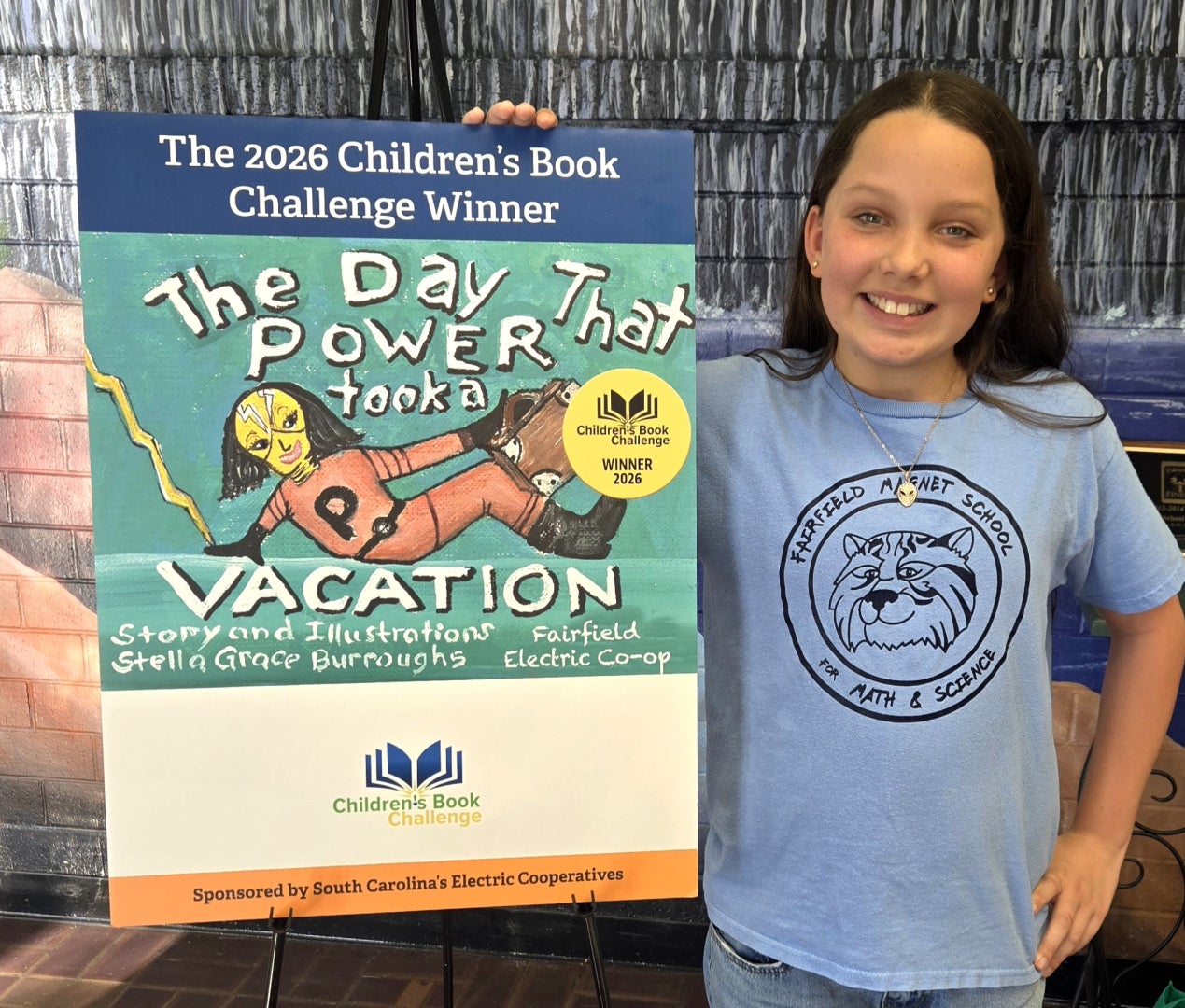 Winnsboro, SC – A book written and illustrated by Stella Grace Burroughs, a fourth-grade student at Fairfield Magnet School for Math and Science, has won the South Carolina Children’s Book Challenge, individual division. Stella Grace created The Day That Power Took a Vacation, which was chosen among nearly 200 statewide submissions by a panel of judges representing South Carolina’s electric cooperatives.